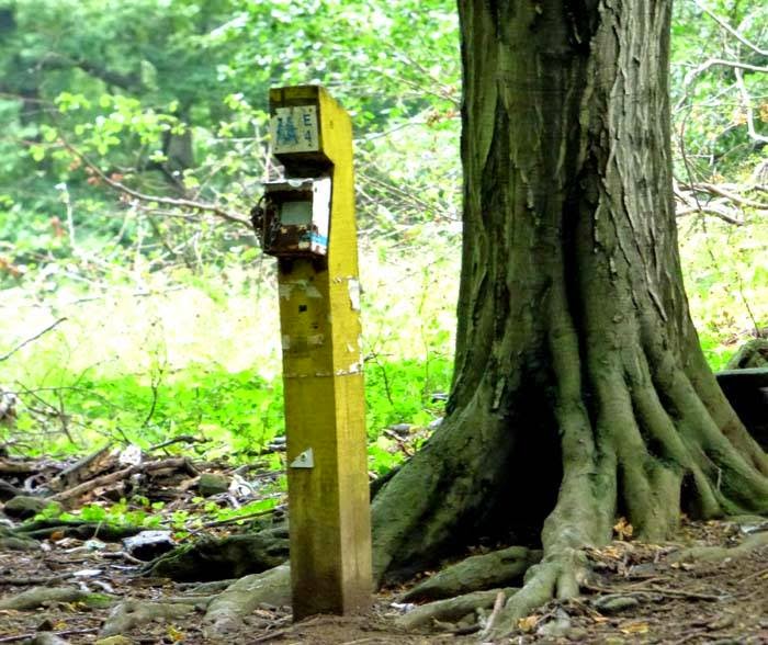 Jól laktunk, majd felkerekedtünk és visszaindultunk az útjelző oszlophoz. És akkor...nos, akkor az útjelző oszlop előtt pár méterre megláttuk a sárga oszlopot, rajta a pecséttel.)Majdnem kiütötte a szemünket a sárga oszlop meg a pecsét is:) Ám mivel az élt bennünk, hogy a háznál kell bélyegeznünk, így az orrunk előtt álldogáló evidenciát észre sem vettük. Szóval itt pecsételtünk: